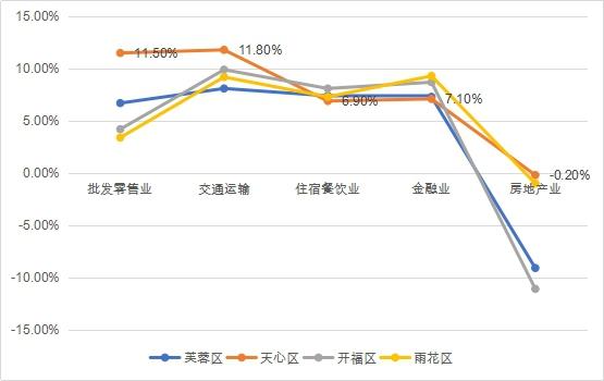 從增加值來看,天心區金融業為第一大產業,占服務業的比重約為40%,說明天心區金融業在服務中地位顯著。批發零售業為第二大產業,說明了“五一”商圈以及由此產生的商貿業存在較大影響力。