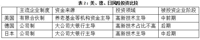 直接融資主導(dǎo)的美國(guó),在風(fēng)險(xiǎn)投資的運(yùn)作模式基本成熟,而間接融資模式主導(dǎo)的日本和德國(guó)現(xiàn)代體制還有待健全。