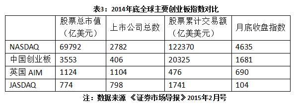 2014年底,比較納斯達(dá)克、英國(guó)AIM和日本佳斯達(dá)克市場(chǎng),從企業(yè)數(shù)量來(lái)看和資產(chǎn)規(guī)模來(lái)看,以間接融資為主導(dǎo)的日本和英國(guó)愿意按低于直接融資的美國(guó);從換手率來(lái)看,英國(guó)市場(chǎng)全年不到0.5次,說(shuō)明市場(chǎng)交易冷清。
