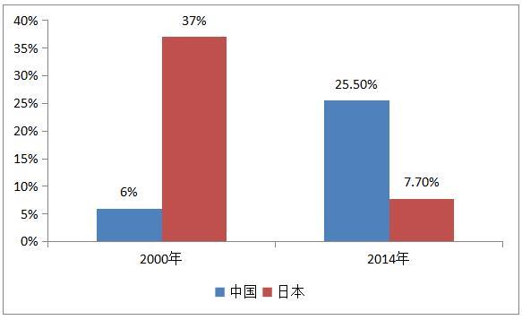 圖:中日兩國高科技產(chǎn)品出口占全球份額的變化