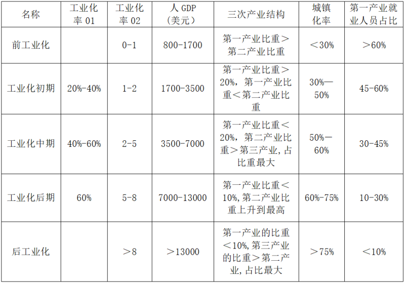 工業(yè)化進(jìn)程一般分為前工業(yè)化、工業(yè)化初期、工業(yè)化中期、工業(yè)化后期和后工業(yè)化五大階段,根據(jù)國(guó)際通行的研究成果,主要判斷指標(biāo)有工業(yè)化率、人均GDP、三次產(chǎn)業(yè)結(jié)構(gòu)、城鎮(zhèn)化率、就業(yè)人口結(jié)構(gòu)等標(biāo)準(zhǔn)。