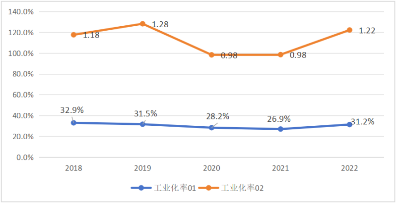 從工業(yè)化率來(lái)看,有兩種計(jì)算方法:工業(yè)化率(01)=工業(yè)增加值占地區(qū)生產(chǎn)總值比重,工業(yè)化率(02)=工業(yè)增加值與農(nóng)業(yè)增加值的比值。2020年以來(lái)江陵縣工業(yè)增加值保持兩位數(shù)快速增長(zhǎng),2022年工業(yè)增加值占地區(qū)生產(chǎn)總值比重為31.2%,工業(yè)增加值與農(nóng)業(yè)增加值的比值為1.22,處于工業(yè)化初期階段。