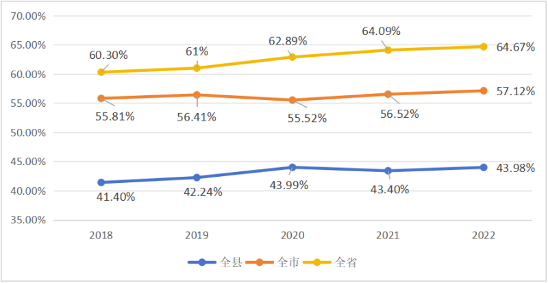 從城鎮(zhèn)化率來(lái)看,2018-2020年,江陵縣城鎮(zhèn)化率保持較快增長(zhǎng),2020年以后城鎮(zhèn)化率發(fā)展趨于緩慢,維持在44%水平,處于工業(yè)化初期階段。江陵縣城鎮(zhèn)化率遠(yuǎn)遠(yuǎn)低于全市、全省水平,城鎮(zhèn)化進(jìn)程較為滯后,仍有較大提升空間。