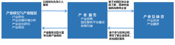 以產業研究與產業規劃為先導,鎖定和跟蹤一批重點園區,為其提供深入產業服務,解決其發展過程中急需解決的問題;在服務園區及其相關企業的過程中,為質地優良的園區和企業提供投融資服務,以實現園區、被服務企業和公司持續共贏為基本特征,最終將公司發展成橫跨全產業鏈輕資產產業服務商。